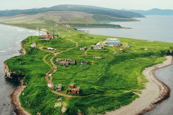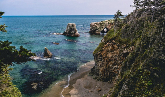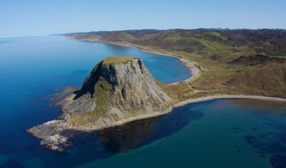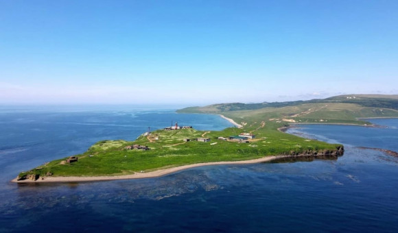 Здесь растут морской шиповник, термопсис, азалия, мертензия. Травы в песчаной бухте создают запоминающийся пейзаж. Готовьтесь к шуму чаек и знакомству со скальным островком.